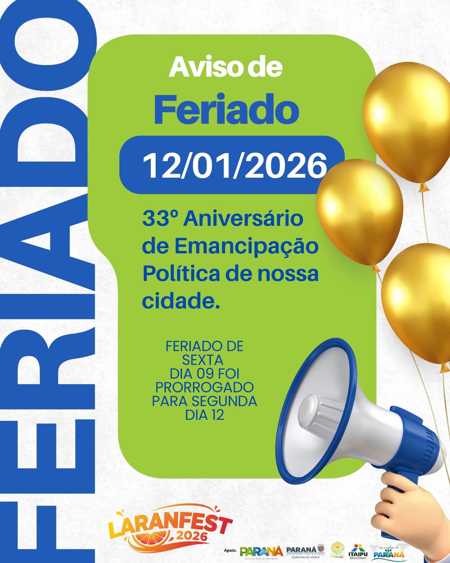 Devido à realização da programação comemorativa, o feriado municipal do dia 9 de janeiro foi prorrogado para a próxima segunda-feira, dia 12. Com isso, segunda-feira será feriado em Laranjal, permitindo que a população participe e aproveite melhor as celebrações alusivas ao aniversário do município.