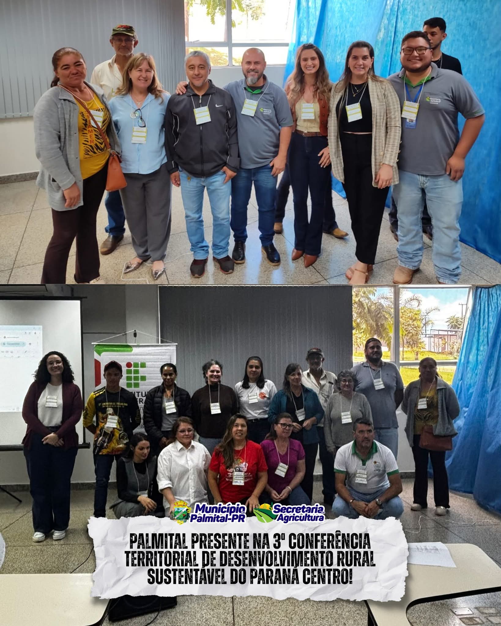 A Secretaria Municipal de Agricultura de Palmital esteve presente na 3ª Conferência Territorial de Desenvolvimento Rural Sustentável do Paraná Centro, evento que reuniu representantes de diversos municípios para discutir políticas e ações voltadas ao fortalecimento do campo, da agricultura familiar e do desenvolvimento sustentável regional. 🌱