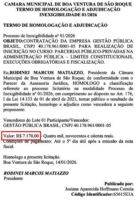 A Câmara de Vereadores de Boa Ventura de São Roque realizou a primeira contratação de 2026 envolvendo uma empresa pertencente a um ex-vereador de Pitanga, com sede em Curitiba, para ministrar cursos aos parlamentares. O valor do contrato é de R$ 7.170.