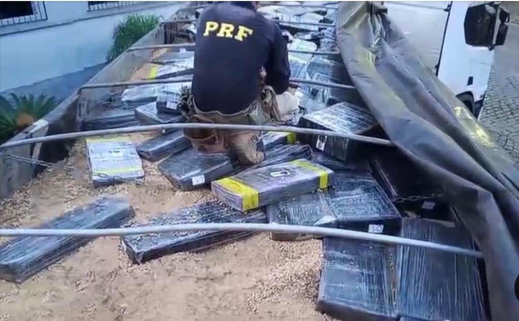 Segundo a PRF, o condutor apresentou nervosismo excessivo e deu informações contraditórias sobre o trajeto e os pontos de parada, o que levantou suspeitas. Após uma inspeção detalhada, os policiais localizaram 153 fardos de maconha prensada, misturados à carga de grãos.